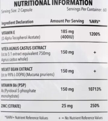 D-Alpha Tocopherol Acetate (Vit E), Vitex-Agnus Castus Extract, Velvet Bean Extract, Pyridoxal 5’ Phosphate Monohydrate (Vit B6), Capsule shell HMPC (hydroxypropyl methylcellulose), Zinc Citrate.