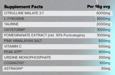 Citrulline Malate 2:1, L-Tyrosine, Taurine, Oxystorm® (Amaranth Extract), Flavouring, Acidity Regulator (Malic Acid), Pink Himalayan Salt, Vitamin C (as Ascorbic Acid), Peak ATP® (Adenosine 5’-Triphosphate Disodium), Anti-Caking Agent (Silicon Dioxide), Uridine Monophosphate, Sweetener (Sucralose), CognatiqTM (Coee (Coea arabica) Fruit Extract), Colouring (Caramel E150c), Anti Foam, Pomegranate Extract (Fruit) 15:1 Ratio, AstraGin® (Astragalus Membranaceus and Panax Notoginseng)