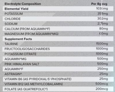 Acidity Regulators (Malic Acid), Taurine, Fructooligosaccharides, Potassium Citrate, Aquamin®MG (Marine Minerals supplying Magnesium Citrate), Flavouring, Pink Himalayan Salt, Aquamin®F (Marine Algae supplying Calcium), Anti-Caking Agent (Silicon Dioxide), Colouring (Red Beetroot Powder), Sweetener (Sucralose), Pyridoxal 5’-Phosphate (Vitamin B6), AstraGin® (Astragalus Membranaceus and Panax Notoginseng), Methylcobalamin (Vitamin B12), Quatrefolic® [(6S)-5-Methyltetrahydrofolic acid, Glucosamine Salt].