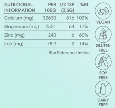• Contains Calcium, Magnesium, Iron, Zinc, Selenium and Iodine